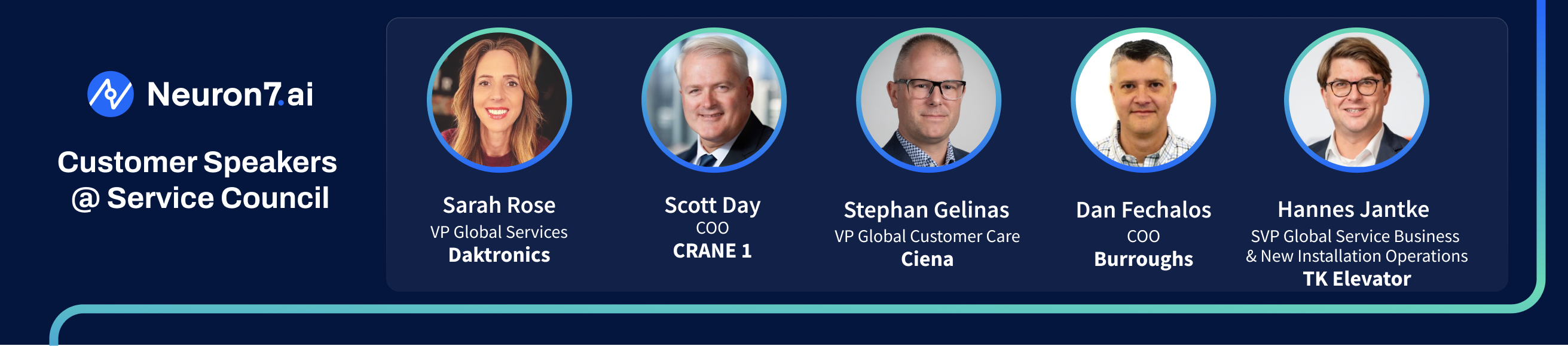 Throughout the week, Neuron7 customers were the real highlight. Sarah Rose of Daktronics, Scott Day of Crane 1, Stephan Gelinas of Ciena, and Dan Fechalos of Burroughs showed what Service AI success looks like: faster onboarding, smarter parts decisions, and higher resolution accuracy where it matters most.