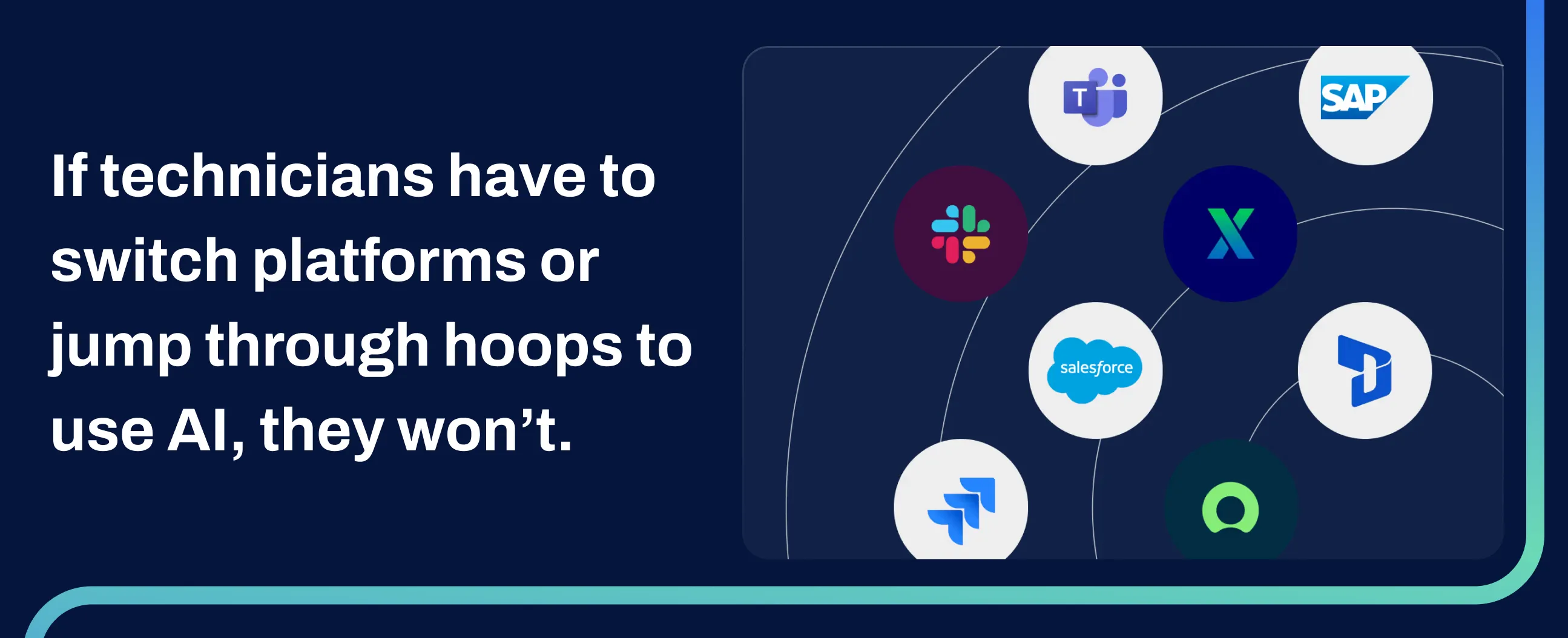 If technicians have to switch platforms or jump through hoops to use AI, they won’t. Instead, integrate it directly into the tools they already use, such as ServiceNow, Slack, and Salesforce.