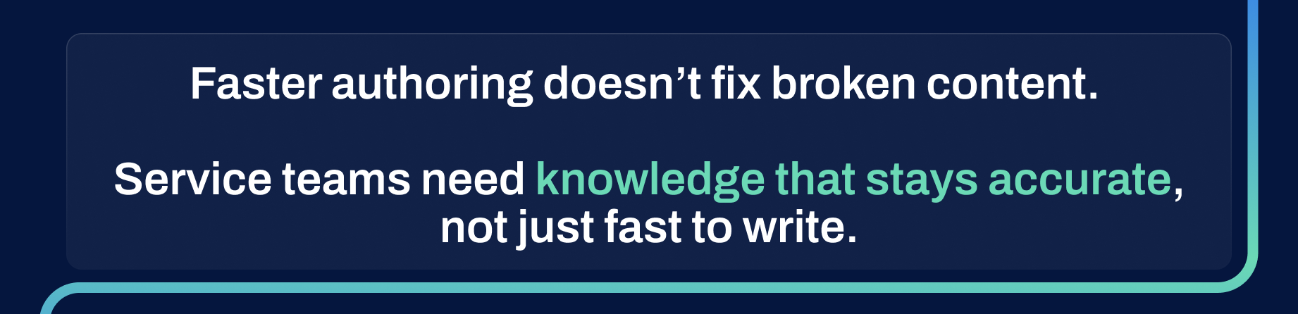 Products update continuously. Processes evolve. Field technicians discover new solutions daily. Meanwhile, knowledge base articles remain frozen in time until someone manually identifies, updates, and republishes them. By the time an article goes live, key sections may already be obsolete.